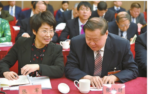 全国人大代表张军(左)与张汝财审议政府工作报告。