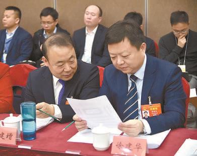 全国人大代表郭建增(左)与全国人大代表徐建华审议政府工作报告。