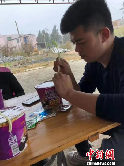 图为:出差途中,一碗泡面常常是丁少鹏的一顿饭。 天台公安供图 摄