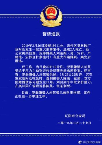 通报称,当日晚20时10分许,犯罪嫌疑人刘某梁迫于压力主动到宏伟分局曙光派出所投案。经审查,犯罪嫌疑人刘某梁供述:3月25日22时许,其在案发地附近吃饭时,遇到被害人陈某、张某,双方因赌博债务问题发生口角,刘回到车中取来折叠刀,在奥林园广场附近将陈某、张某刺死。