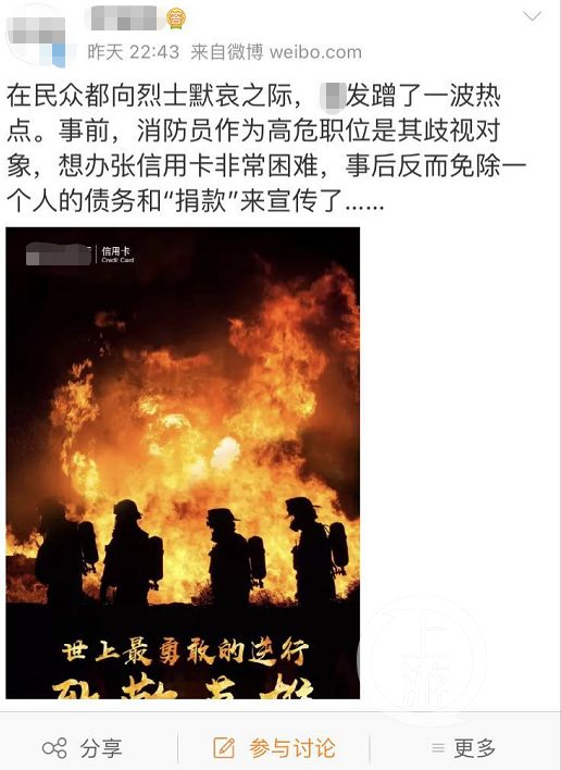 记者了解到,以免除烈士欠款作为主要内容的海报首发来自某发银行信用卡员工的朋友圈,被大量转发后,有网友通过微博等社交渠道质疑这一行为。多名网友表示:“在民众都向烈士默哀之际,某发银行蹭了一波热点。事前,消防员作为高危职位,想办张信用卡非常困难,事后反而用免除一个人的债务和‘捐款’来宣传自己。”