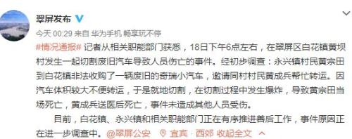 中新网4月19日电 据四川省宜宾市翠屏区人民政府新闻办公室官方微博消息,18日下午6点左右,在翠屏区白花镇黄坝村发生一起切割废旧汽车导致人员伤亡的事件。
