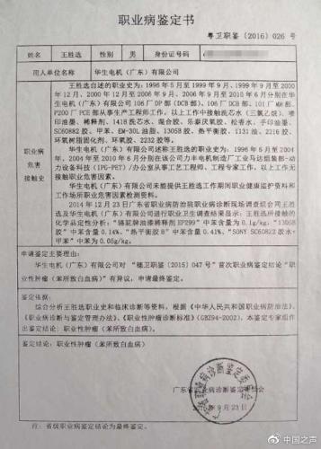 罹患白血病的职工邹秀华的妻子告诉记者,她当时和丈夫一起进的工厂,他的丈夫在华生电机工作1年4个月,就患上了白血病,此后他们多次申请职业鉴定,第三次鉴定被鉴定为职业性肿瘤,“我和邹秀华,是两夫妻同时进的工厂,他是2013年1月进的工厂,2014年6月患病。一共是三次(鉴定),最后就做了广东省省级鉴定,在工作现场抽样的一些检测。报告的一些数据,因为它都是有含苯的,所以提交这个数据上去以后,鉴定结果下来了,被鉴定为职业性肿瘤、苯所致白血病。”