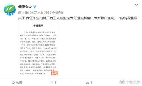 5月11日,深圳市宝安区卫生健康局就此事进行通报,表示华生电机有限公司共发生5例白血病,5名患者分布在5个不同的车间,属不同工种,入职年限为2年-16年。该公司2015年、2017年曾因未对员工按规定进行职业健康检查被罚款共计10.5万元。