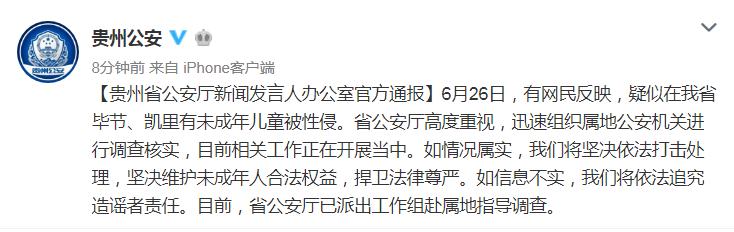 贵州省公安厅表示,如情况属实,将坚决依法打击处理,坚决维护未成年人合法权益,捍卫法律尊严。如信息不实,将依法追究造谣者责任。