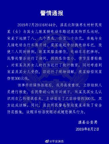根据淇县公安局官方微博发布的通报,7月29日6时44分,淇县北阳镇枣生村村民宋某(女)与其女儿耿某骑电动车路过庞某的西瓜地时,宋某下地摘了八、九个西瓜,价值二十余元。当她与女儿骑电动自行车离开时,庞某追赶中拉拽电动车把,致使三人同时摔倒。耿某双膝盖擦伤,电动车车把摔坏。民警出警后进行了询问,因西瓜价值小,情节显著轻微,对宋某及其女儿的行为进行了批评教育。同时考虑到宋某及其女儿受伤,即进行了现场调解,庞某赔偿宋某伤情300元。