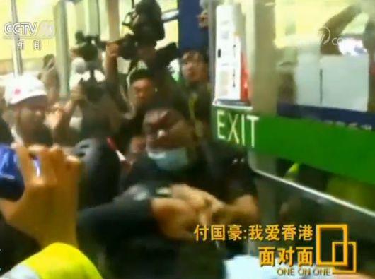 付国豪一边辩解,一边试图逃脱,但马上被拉了回来。四五个人合力把付国豪的背包抢走。在付国豪看不见的地方,他的背包被暴徒打开,里面的物品被一一翻出,散落在地上。暴徒们看到了付国豪环球时报同事的名片,还有那件印有“我爱香港警察”的蓝色衣服。