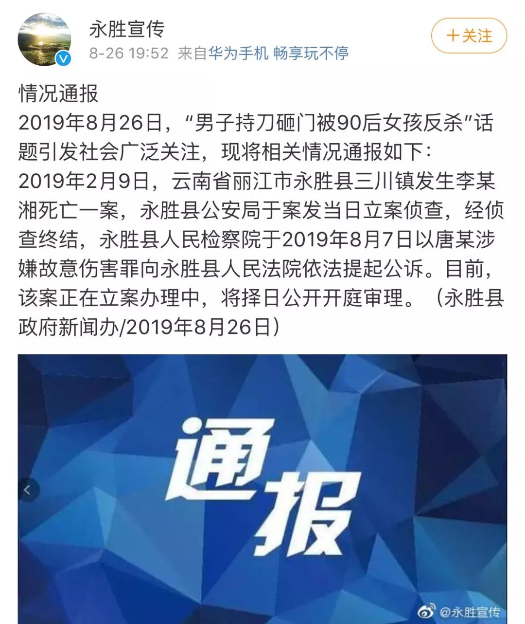 8月26日,永胜县政府新闻办发布情况通报称:永胜县人民检察院于2019年8月7日以唐某涉嫌故意伤害罪向永胜县人民法院依法提起公诉。目前,该案正在立案办理中,将择日公开开庭审理。