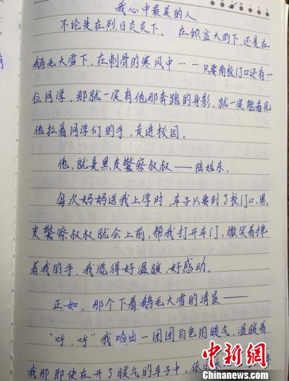 2014年,华罗庚实验学校开展了一次以“描写熟悉的人”为主题的作文竞赛,其中有一个班上40多名学生都写到了陆旭东。有学生写道:“烈日下,寒风里,迎朝阳,送晚霞。重复着不变的姿势,一次又一次,一批又一批,把我们护送进学校。他的微笑里饱含着温馨,眼神里充满着暖意,他是我们最美的‘黑皮警察’!”