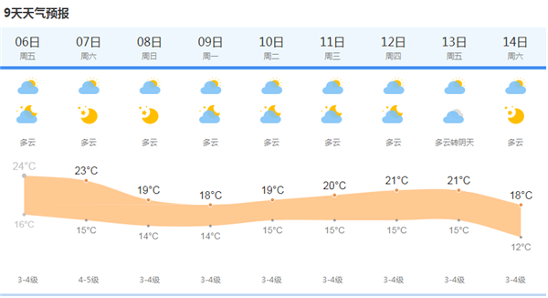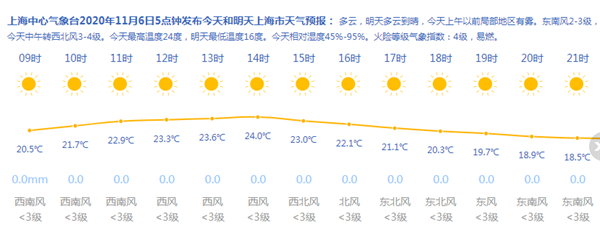 上海中心气象台2020年11月6日5点钟发布今天和明天上海市天气预报:多云,明天多云到晴,今天上午以前局部地区有雾。东南风2-3级,今天中午转西北风3-4级。今天最高温度24度,明天最低温度16度。