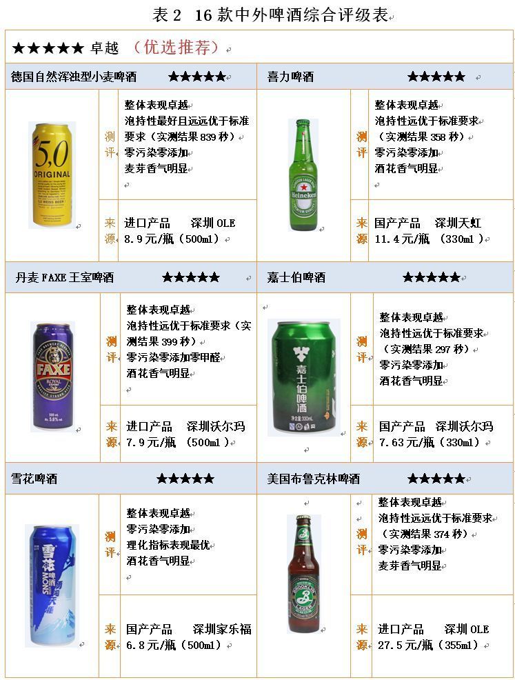 16款中外啤酒中,获得五星评级有6款,四星评级有6款,三星评级有4款。
