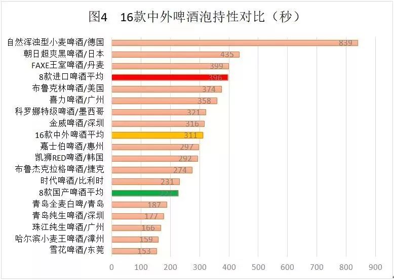 16款中外啤酒泡持性最好的是德国自然浑浊型小麦啤酒达到839秒,8款国产啤酒泡持性最好的是喜力啤酒达到358秒。