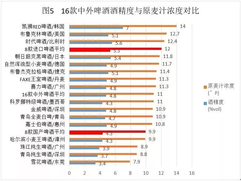 8款进口啤酒酒精度与原麦汁浓度平均达到5.3 %vol和12°P,8款国产啤酒平均达到4.3 %vol和9.9°P,16款啤酒酒精度与原麦汁浓度最高的是韩国凯狮RED啤酒。
