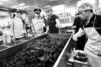 “把你们店小龙虾的进货票证出具一下。”昨晚7时,北青报记者跟随东城区食药监局执法人员来到簋街的一家餐厅,特色食品“小龙虾”是本次检查的重点。操作间内码放着一箱箱仍在挥舞着虾钳的小龙虾,六七名工作人员正在小龙虾进行分拣、清洗。据介绍,夏季簋街小龙虾的日销量在1.5万斤(7.5吨)左右,日消费人数为15000人左右。