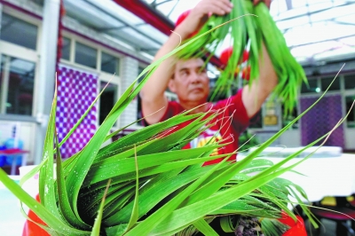 端午节期间,张立启买来苇子叶,给客人包粽子。