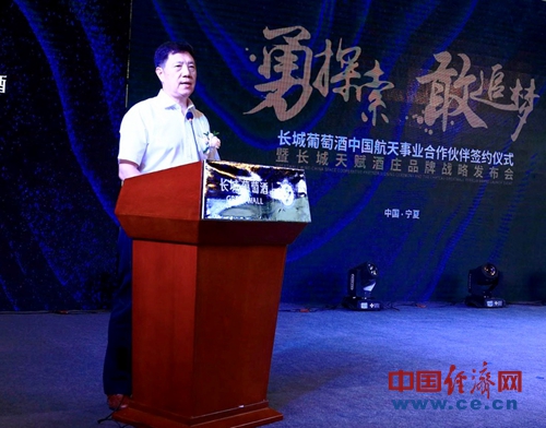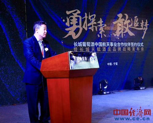 中粮酒业有限公司董事长王浩代表长城人感谢了宁夏政府及行业内领导的肯定,他强调:“长城葡萄酒的战略定位是‘中国长城,红色国酒’,作为唯一真正能代表中国的民族葡萄酒品牌,中国长城葡萄酒伴随改革开放荣耀40年,以国酒品质多次登上国宴舞台。长城葡萄酒正式成为中国航天事业的合作伙伴,这对于长城来说是一个非常重要的契机,长城要大力弘扬航天精神,做好“红色国酒”,为光荣的航天事业增光添彩。更充分地发扬长城的红色基因优势,奋发图强、攻坚克难,坚持战略引领发展,创新驱动成长,要让“红色国酒”逐步崛起于世界葡萄酒之林,就像中国航天崛起于世界民族之林一样,共同助力祖国的伟大复兴。”