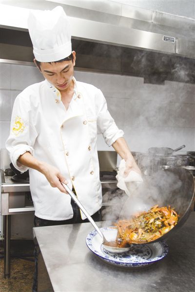 图为厨师正在制作六月黄烧汪丁。