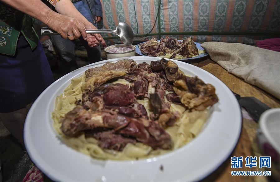 在新疆塔城地区巴尔鲁克山的一处夏季牧场,50岁的牧民赛以拉·阿那尔太在制作传统美食“纳仁”(多由风干马肉或羊肉,搭配面条组合而成)(6月23日摄)。 新华社记者胡虎虎摄