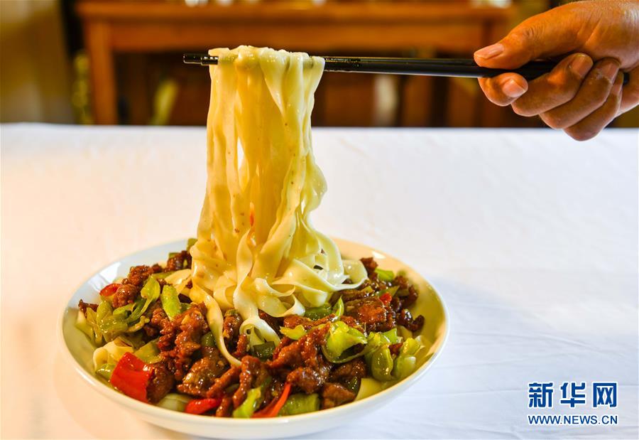 在新疆奇台县一家名叫“金古城”的餐厅里,厨师在展示当地美食“过油肉拌面”(7月25日摄)。 新华社记者赵戈摄