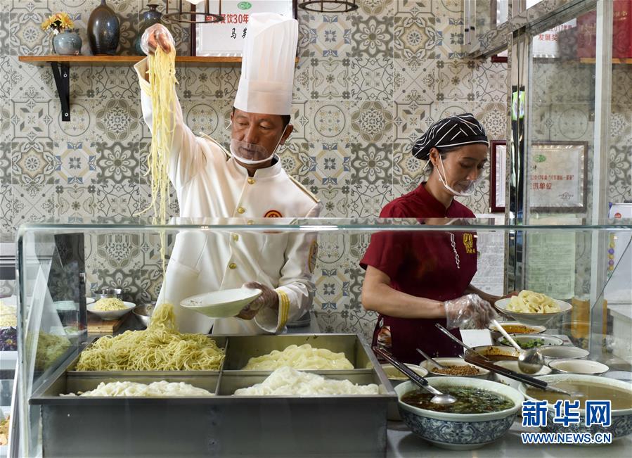 在新疆奇台县一家名叫“金古城”的餐厅里,厨师在制作当地美食“过油肉拌面”(7月25日摄)。 新华社记者赵戈摄