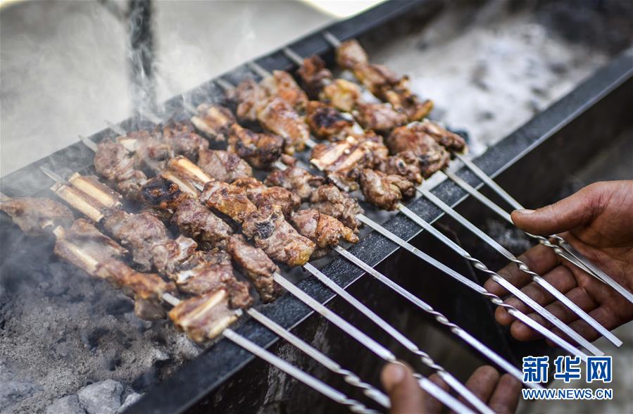 在新疆昌吉市一家农家乐里,厨师正在制作“烤羊排”(2017年4月28日摄)。 新华社记者赵戈摄