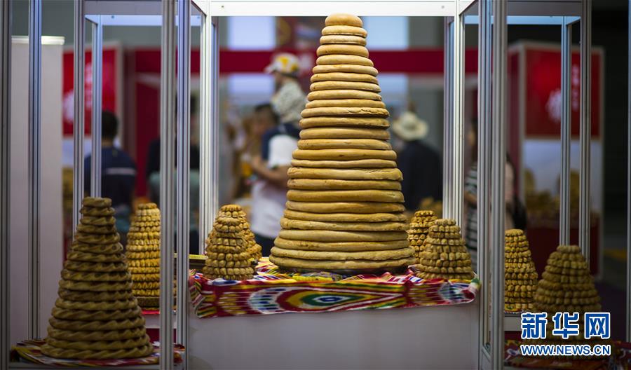 在第七届乌鲁木齐国际食品餐饮博览会上展示的各种类型的馕(2017年5月22日摄)。 新华社记者江文耀摄
