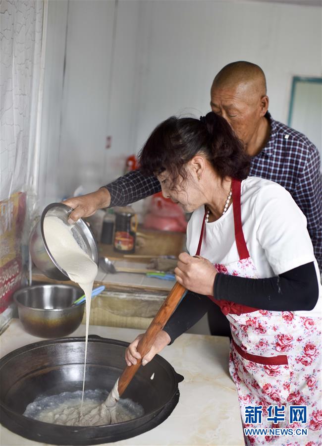 在新疆江布拉克景区内,农户赵淑芝(前)正在制作“洋芋搅团”(7月27日摄)。 新华社记者赵戈摄
