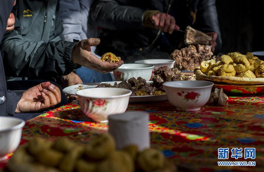 宾客在新疆塔什库尔干塔吉克自治县的乡村传统婚礼上享用手抓饭(2017年11月12日摄)。 新华社记者胡虎虎摄