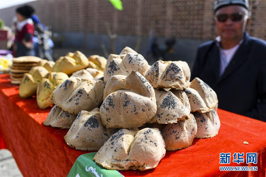 在新疆吐鲁番市高昌区艾丁湖镇也木什村,巴扎上出售的苞谷面馕(2017年3月14日摄)。 新华社记者王菲摄