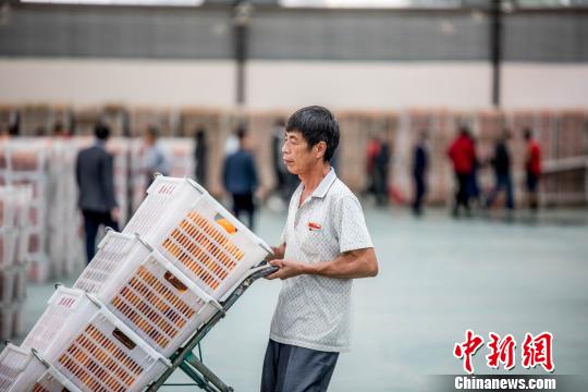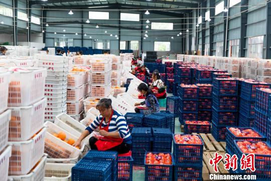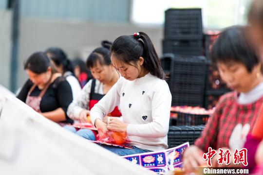 11月16日,工人在江西省安远县一家脐橙加工企业给脐橙鲜果制作包装。 孙磊 摄