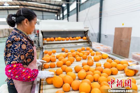 11月16日,工人在江西省安远县一家脐橙加工企业分拣脐橙鲜果。 孙磊 摄