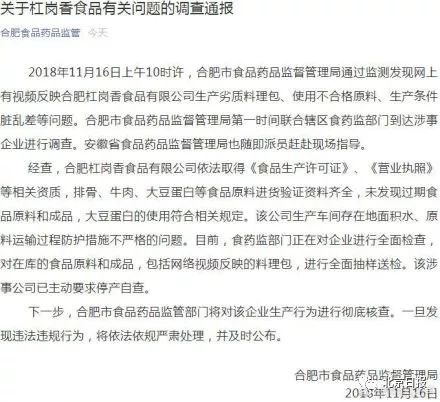 11月16日晚,“合肥发布”通报称,经查,合肥杠岗香食品有限公司依法取得《食品生产许可证》、《营业执照》等相关资质,排骨、牛肉、大豆蛋白等食品原料进货验证资料齐全,未发现过期食品原料和成品,大豆蛋白的使用符合相关规定。该公司生产车间存在地面积水、原料运输过程防护措施不严格的问题。目前,食药监部门正在对企业进行全面检查,对在库的食品原料和成品,包括网络视频反映的料理包,进行全面抽样送检。该涉事公司已主动要求停产自查。下一步,合肥市食品药品监管部门将对该企业生产行为进行彻底核查。一旦发现违法违规行为,将依法依规严肃处理,并及时公布。