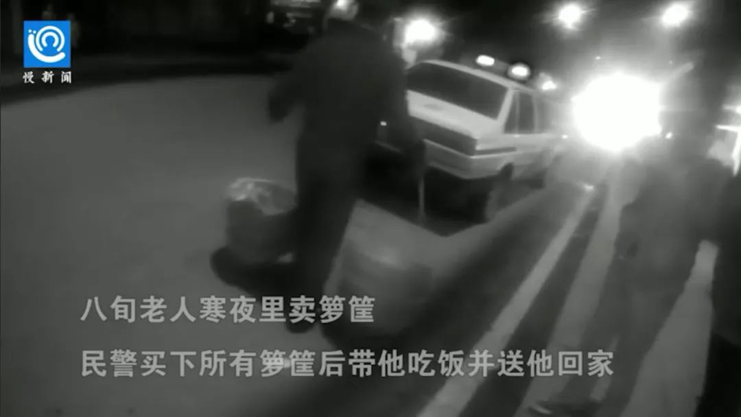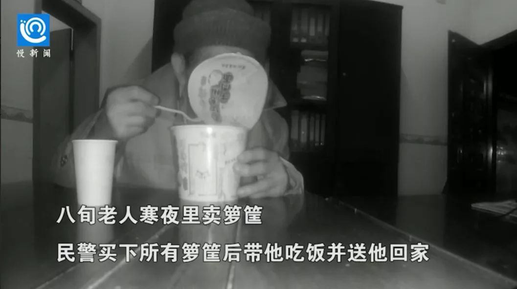 2018年11月17日晚重庆大足区珠溪镇街边商铺门口一名满头白发的老人守着两个箩筐蜷缩的身子在寒风中颤抖老人说他是来赶集卖箩筐的一位民警随即赶到买下老人的全部箩筐并给老人泡了碗热腾腾的面……