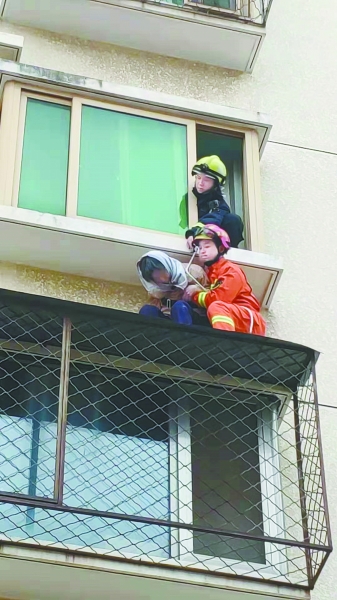 本报讯(记者张宇)前天中午,一名老人因抑郁症爬出窗户,被困在三楼窗户的防护网上面,丰台消防支队出动两个中队到场,消防员利用绳索,成功救下老人。