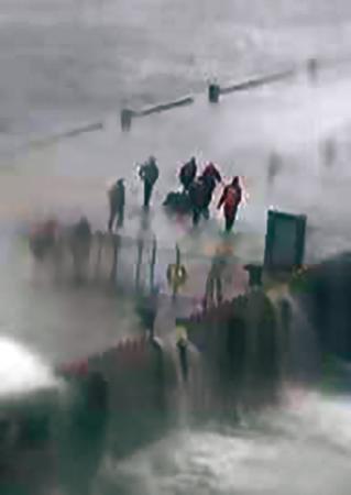 风暴中的抢险现场。这是当时七六○所参与抢险的同志用手机拍摄的现场录像截屏。这一真实场面后来被称为“台风中最英勇的逆行”。七六○所供图