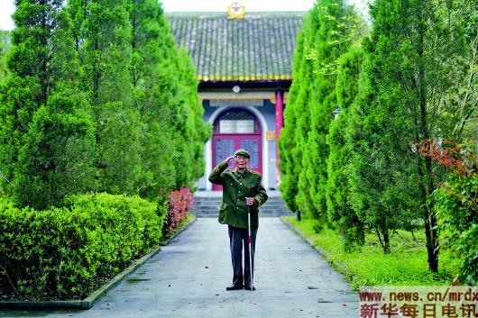 3月27日,程樟柱在纪念馆内向前来参观的游客行军礼。