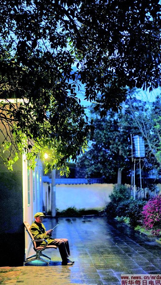 3月27日傍晚,程樟柱在纪念馆内听收音机。
