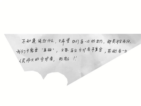 “感谢你们的负重前行,换得我们岁月静好!请你们每次出警一定要平安回来”。