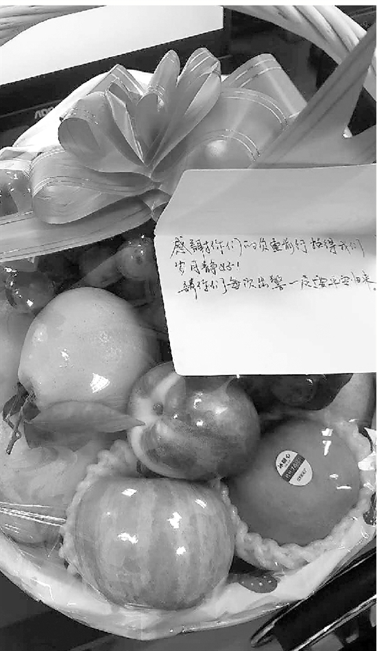 昨天早上,市北消防中队岗亭又收到一篮匿名水果,里面放有一张贺卡,附了一行漂亮的字——