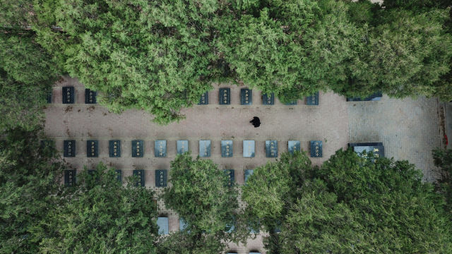 3月21日,张景宪走在张和庄烈士陵园内(无人机拍摄)。