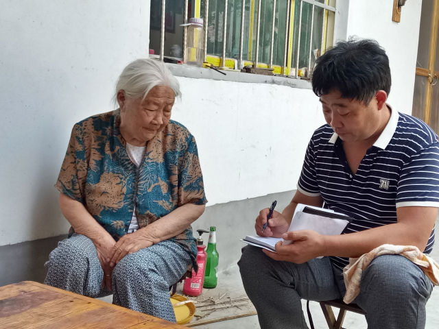 张景宪(右)在山东省新泰市与徐彦墩烈士的嫂子和尚云交谈(2016年6月21日摄)。 新华社发(吉文选 摄)