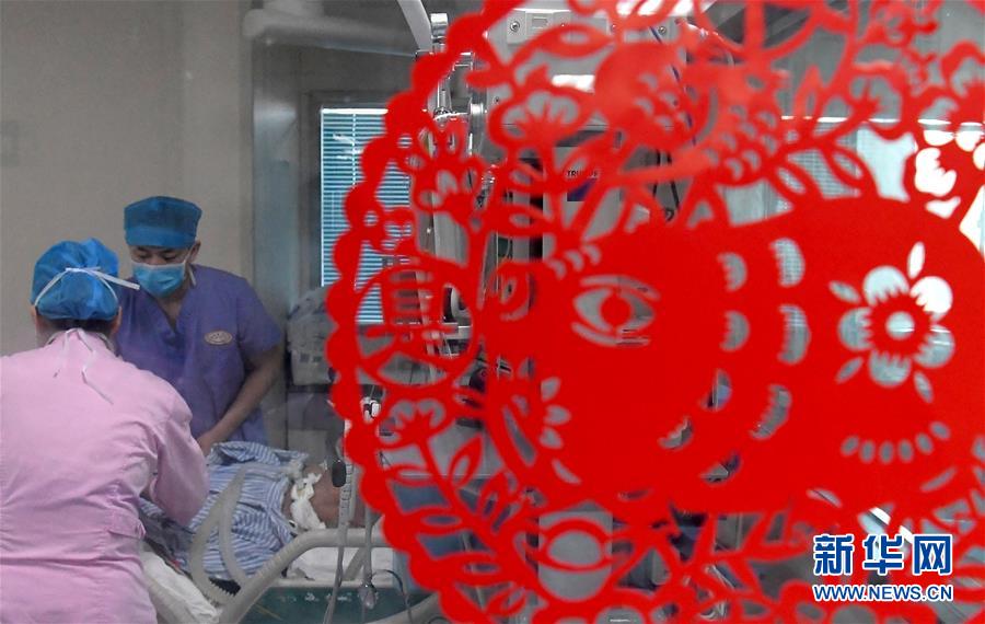 5月10日,在河南省人民医院呼吸重症监护室,谢亚东和同事一起为患者翻身。 新华社记者 李安 摄