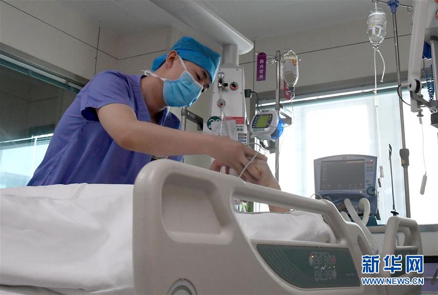 5月10日,在河南省人民医院呼吸重症监护室,谢亚东在评估患者肌力。 新华社记者 李安 摄