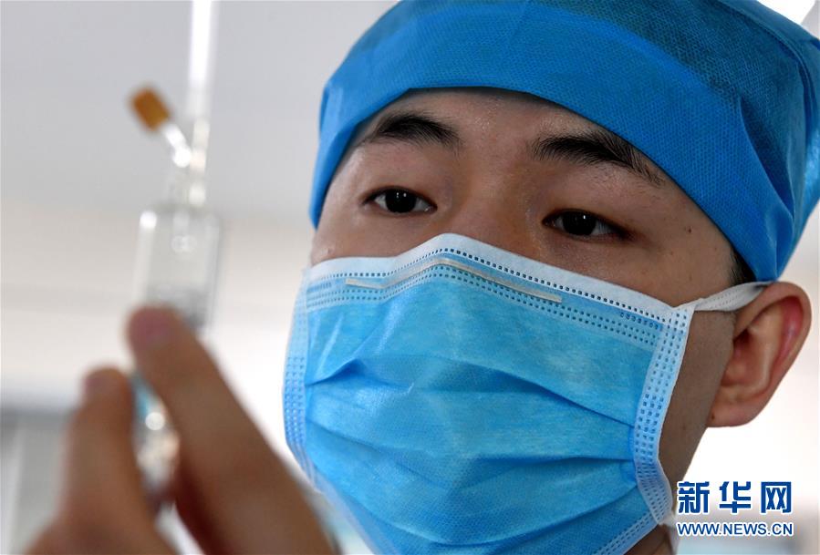 5月10日,谢亚东在河南省人民医院呼吸重症监护室里调节药品滴速。 新华社记者 李安 摄