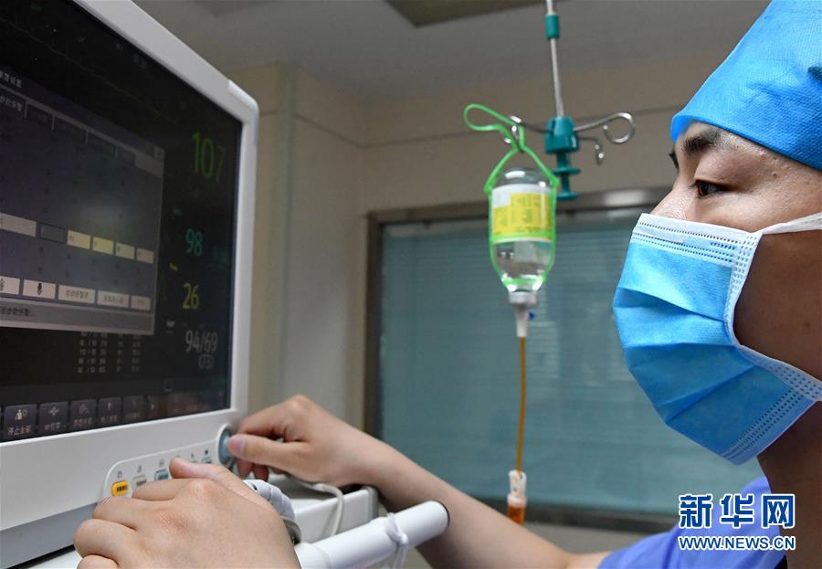 5月10日,谢亚东在河南省人民医院呼吸重症监护室里设置监护仪。新华社记者 李安 摄