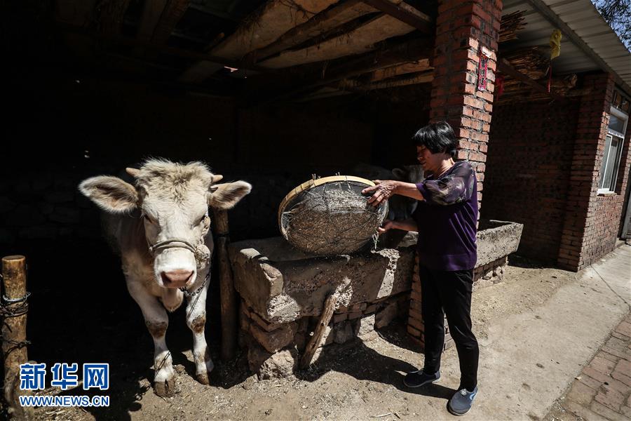 5月23日,韩彩莲在自家院子里喂牛。新华社记者 潘昱龙 摄