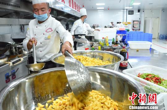 图为“爱老幸福食堂中央厨房”的厨师们正在准备午餐。 鲁丹阳 摄