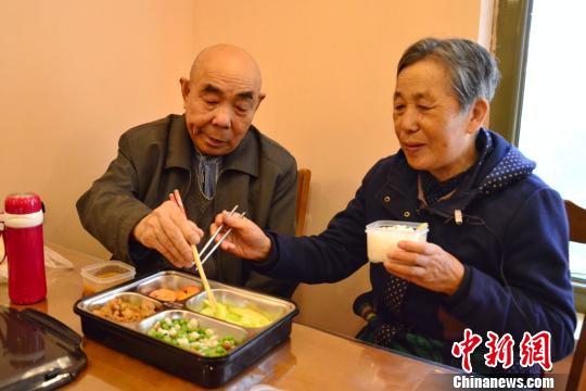 图为82岁的李全年正在和77岁的妻子王改英吃从“爱老幸福食堂中央厨房”送到香格里拉社区幸福食堂的午餐。 鲁丹阳 摄