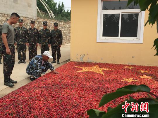 经过精心的测算和刻量,历时3个小时,一幅长7米,宽4.7米的巨幅“樱桃国旗”展现在大家面前。