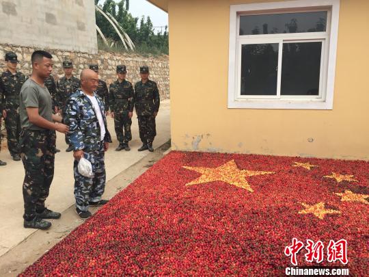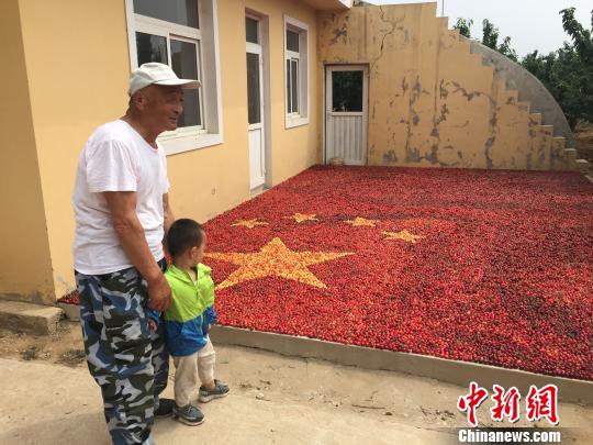 图为阎大爷看到“樱桃国旗”。 常宏基 摄